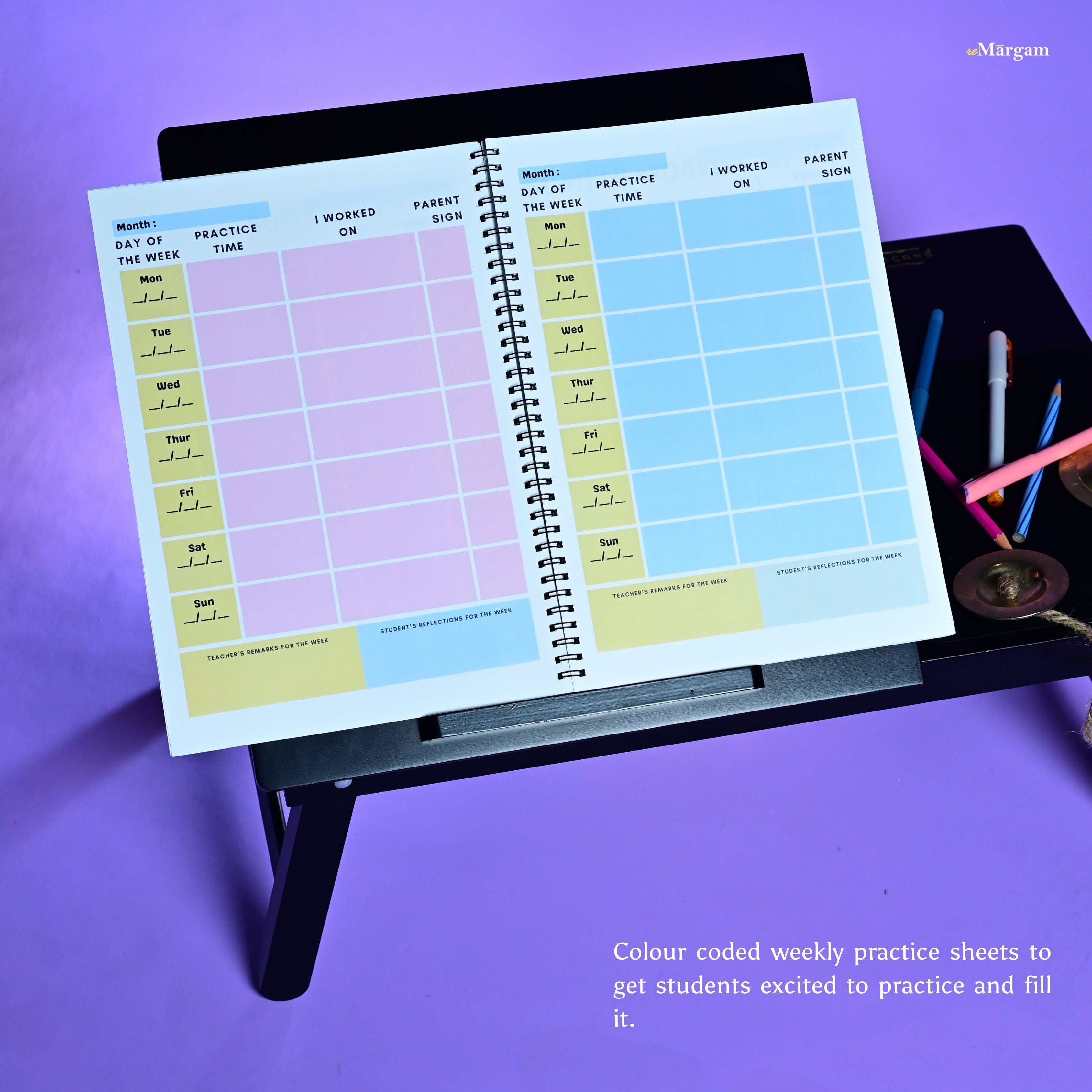The reMargam Music Practice Book is designed for music students and is ideal for music teachers, music institutes, and parents who want to encourage consistent and structured practice at home.